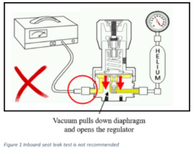We do not recommend performing an inboard seat leak test on regulators (pressurize inlet or outlet with Helium and leak detector pulls vacuum on the outlet or inlet). If vacuum is applied to the inlet of the regulator, if the regulator is closed (no force applied to the range spring), the regulator will remain closed but may not remain leak tight. If vacuum is applied to the outlet of the regulator, even if it is closed, it may open due to the pressure pulling down the diaphragm. This does not apply to pulling vacuum on the outlet of sub-atmospheric delivery regulators which are designed to deliver gas at sub-atmospheric pressures. For more discussion on recommended regulator seat leak testing methods, please see PRODUCT NOTE #422.